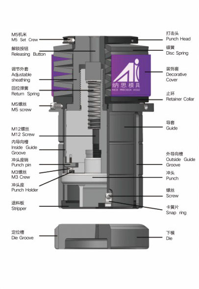 • 標(biāo)準(zhǔn)模具A、B工位的止環(huán)采用雙面錐度設(shè)計(jì),可以雙面使用,增加沖頭刃磨量。